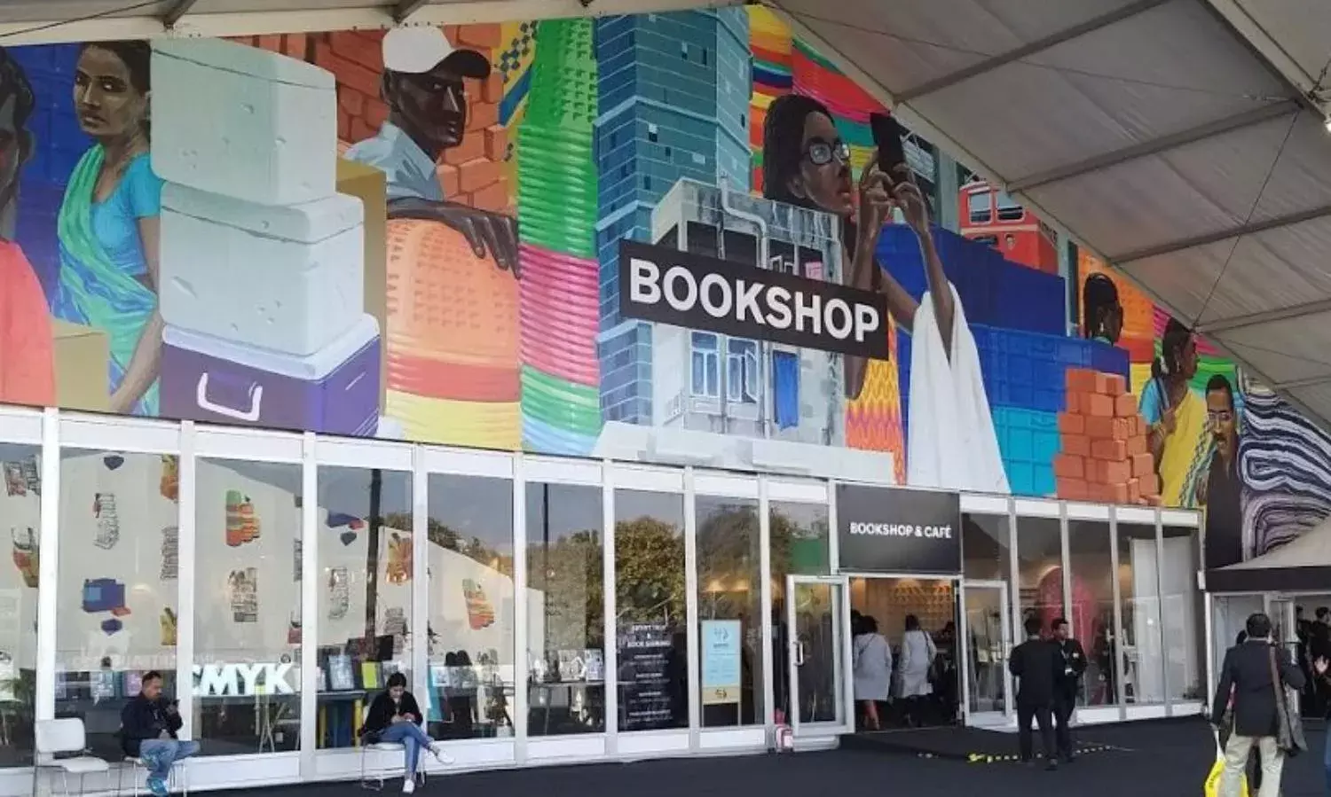 As one walks past the hustle bustle of a crowded boulevard, one approaches the entry of NSIC grounds in Okhla New Delhi that hosts this four-day art event. One can see a sprawling facade design by Artist Sam Kulavoor, celebrating the everyday life of people, adorning the outer walls of the Art Fair, with Bookshops and Cafes adding a fresh winter morning effervescence to the affair.