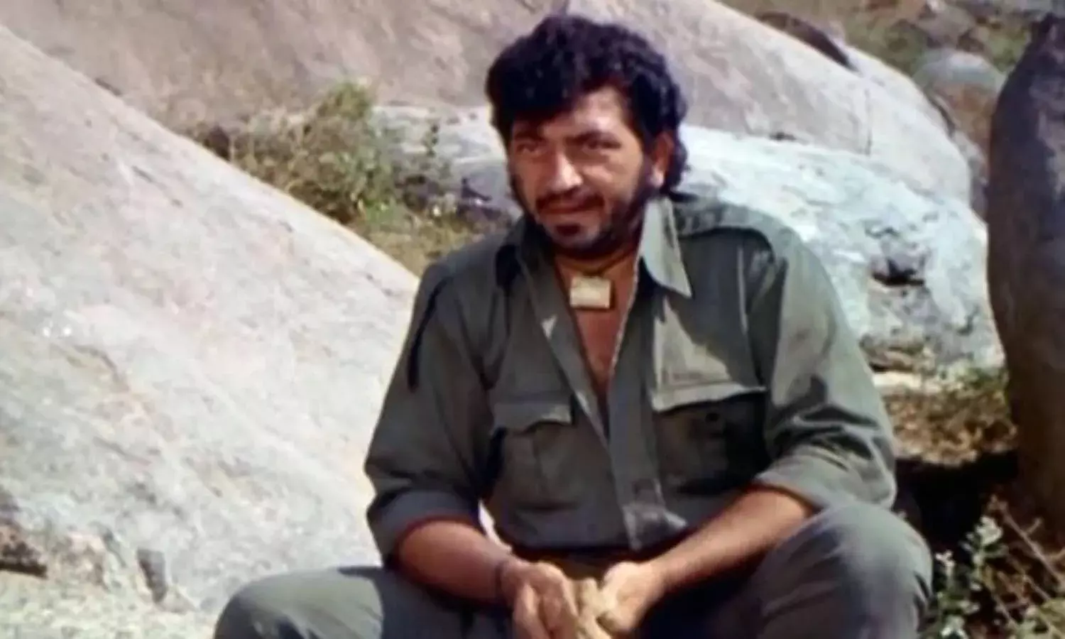 Sippy said that he wanted to replace the normal dacoit costumes in films of shirt and dhoti with olive green safari suit that would resemble military fatigues. So, Gabbar’s costume comprised of this olive-green safari suit, a metallic taveez strung on a black thread across his neck, a cartridge-lined belt he sways this way and that to threaten his men, and a small cloth bag of khaini he chews from time to time and spits out at random. His boots are smart too but covered with a layer of dust. His curly hair is unkempt and he shaves rarely.