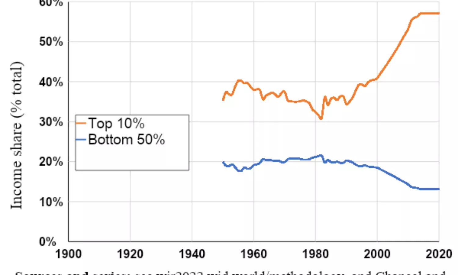 In a surprisingly unfortunate manner, the share held by the lower 50% has constantly been falling in the period after economic reforms. And the gap continues to grow.