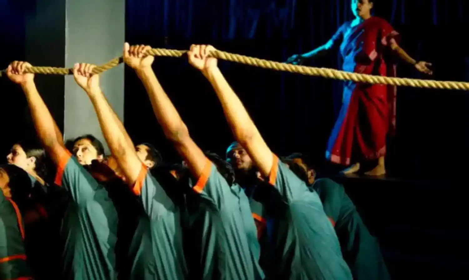 Usha Ganguly who has designed, directed and composed the music has used some thick ropes which metamorphose into agents of bondage, or freedom, portray the waves of a river, trap a character when the rope feels that the character needs to be trapped and imprisoned so beautifully that it evolves almost into an important character in the play. When Dr, Nandini is having labour pains, the girls around her gather some red-and-white ropes to use as a curtain to give her the privacy a mother demands at child-birth.