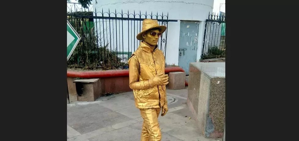Is it real or just a newly-erected statue on a New Delhi pavement? Perhaps a unique expression of public art by the municipal authorities. Many visitors to Connaught Place, the capital’s fashionable shopping centre hurry by scarcely glancing at the golden statue on the pavement. Some pass on after giving a curious look while just a few actually stop for a closer examination and even take pictures with him and put some money in the cardboard box kept nearby. One young man, more daring than others, actually touches the statue in the face to make sure and exclaims: “This is a live human, not a statue.”