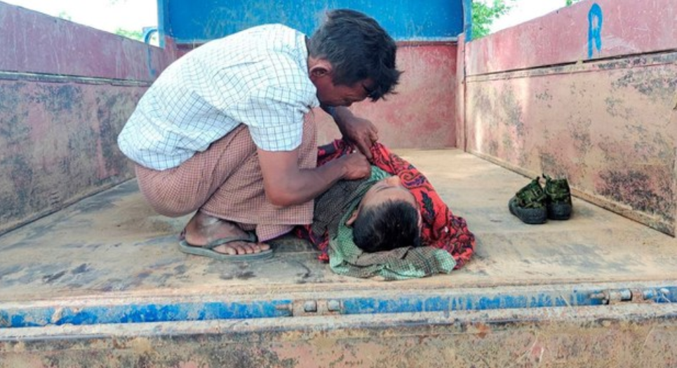 Cover Photograph: A man tends to the body of a child after Myanmar junta helicopters fired on a school in the Maha Dhammaranthi monastery compound near Let Yet Kone village, Sagaing region, Sept. 16, 2022. Source Radio Free Asia.
