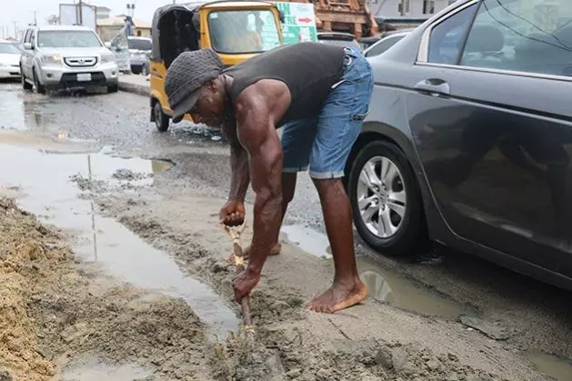 The muscular former weightlifter is a regular sight with a shovel and other working tools in hand filling potholes. Potholes are quite common in Lagos, and they get bigger with time as authorities delay fixing them. Potholes are partially responsible for the chaotic traffic in Lagos, a city where tailbacks could sometimes stretch for about 10 Kilometres. Ironbar fills the potholes in the Ajah-Badore area to ease traffic congestion in the area.