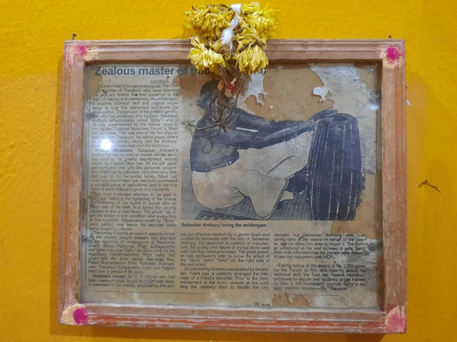 The Mundakanni Amman temple is an important landmark for anyone venturing into the melodic lane of mridangam makers in Mylapore, Chennai. At the end of the lane is Jesudas (67) and Edwin Anthony’s (33) mridangam workshop. On entering, one can discern the musky scent of jackfruit wood and leather that saturate the air. The amber walls are adorned with pictures and figurines of Hindu deities and a photo of Christ. Indeed the most visually striking characteristic of the workshop is its medley of Hinduism and Christianity.