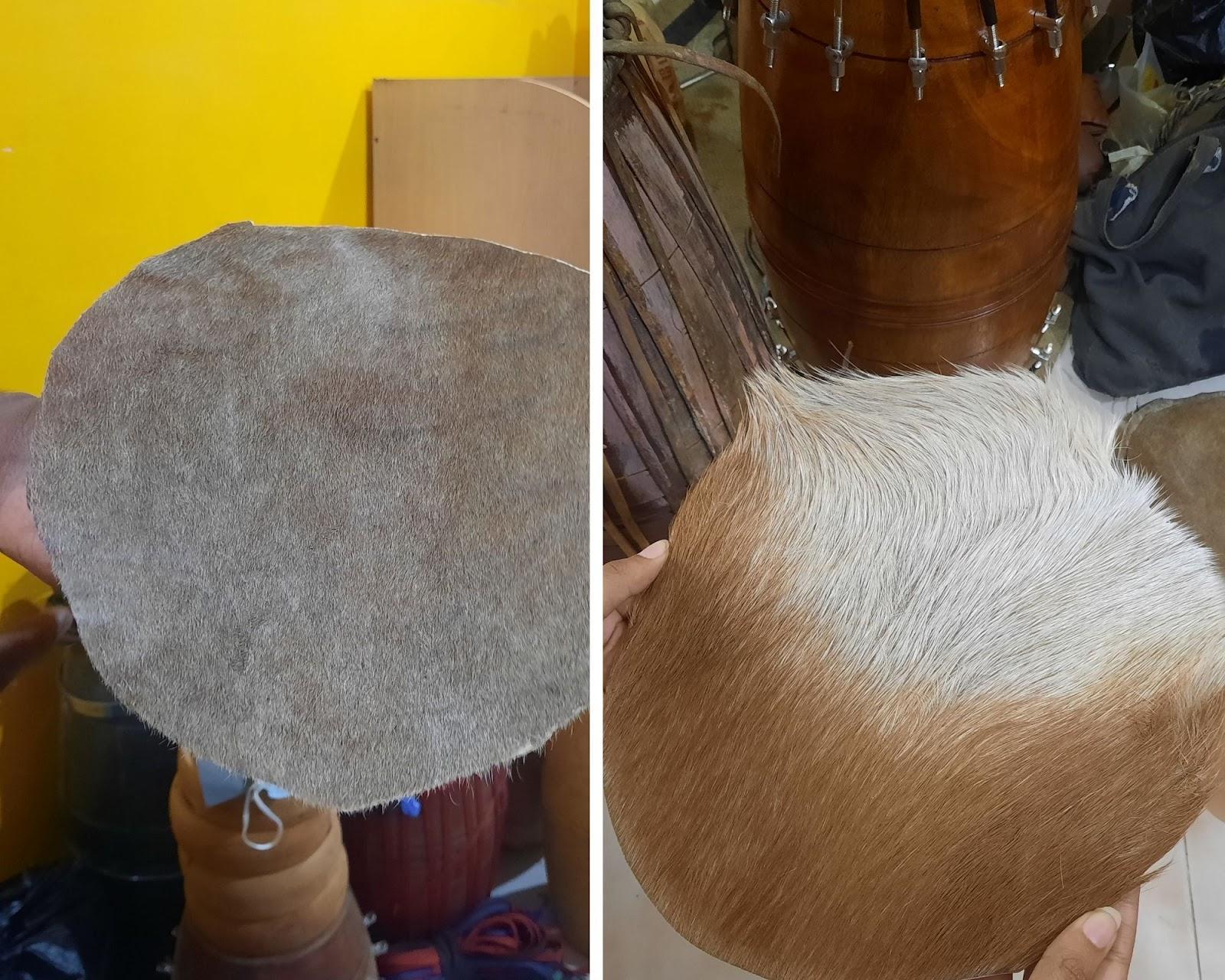 Father and son source jackfruit wood from Panruti in the Cuddalore district, and leather from other areas of Tamil Nadu. Buffalo skin is purchased from Perambur in Chennai, while goat and cow hides are sourced from Ambur and Thanjavur respectively.