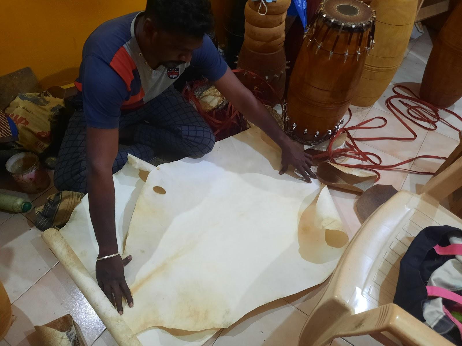 His first job at the workshop was to peel the vaaru (the leather straps wrapping the wooden body of the mridangam) off of mridangams that were sent to them for repair. Gradually, he was promoted to the job of spreading out dried animal skin on the floor, clamping it on all four sides and finally cutting and tooling it.