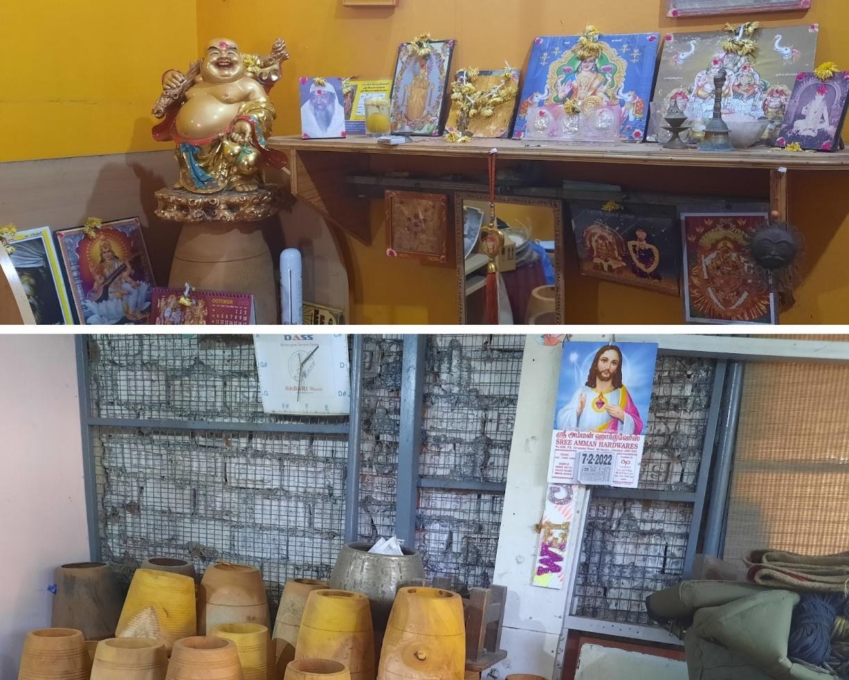 Walls of the workshop adorned with pictures of Hindu deities and Christ