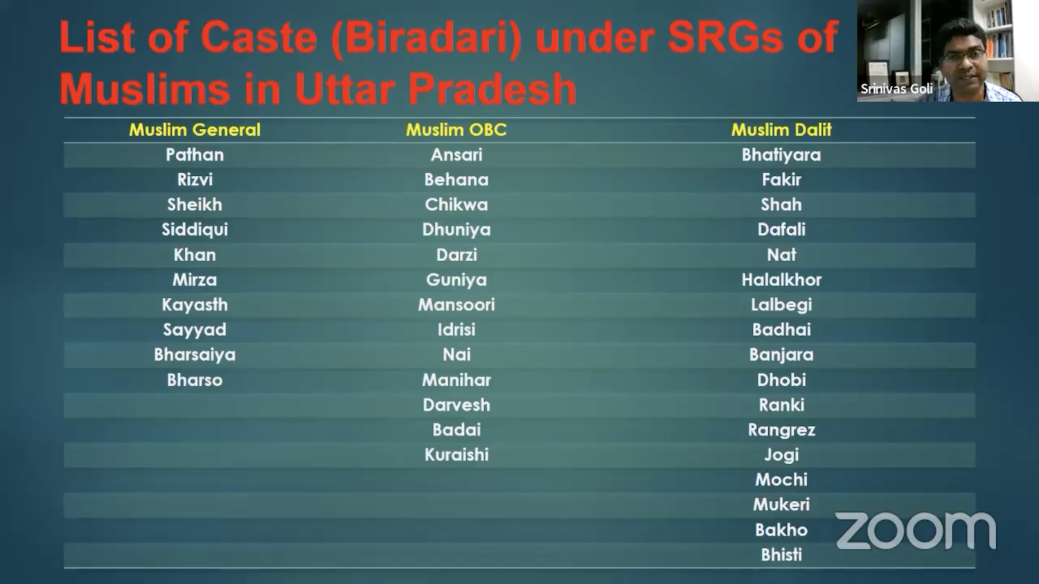 Funded in part by the ICSSR, a government body, it used the socioreligious groupings and occupational categories found in the reports of the Mandal Commission and Sachar Committee, mapping subcastes (jatis and biradaris) onto the officialised categories of SC, General and OBC.