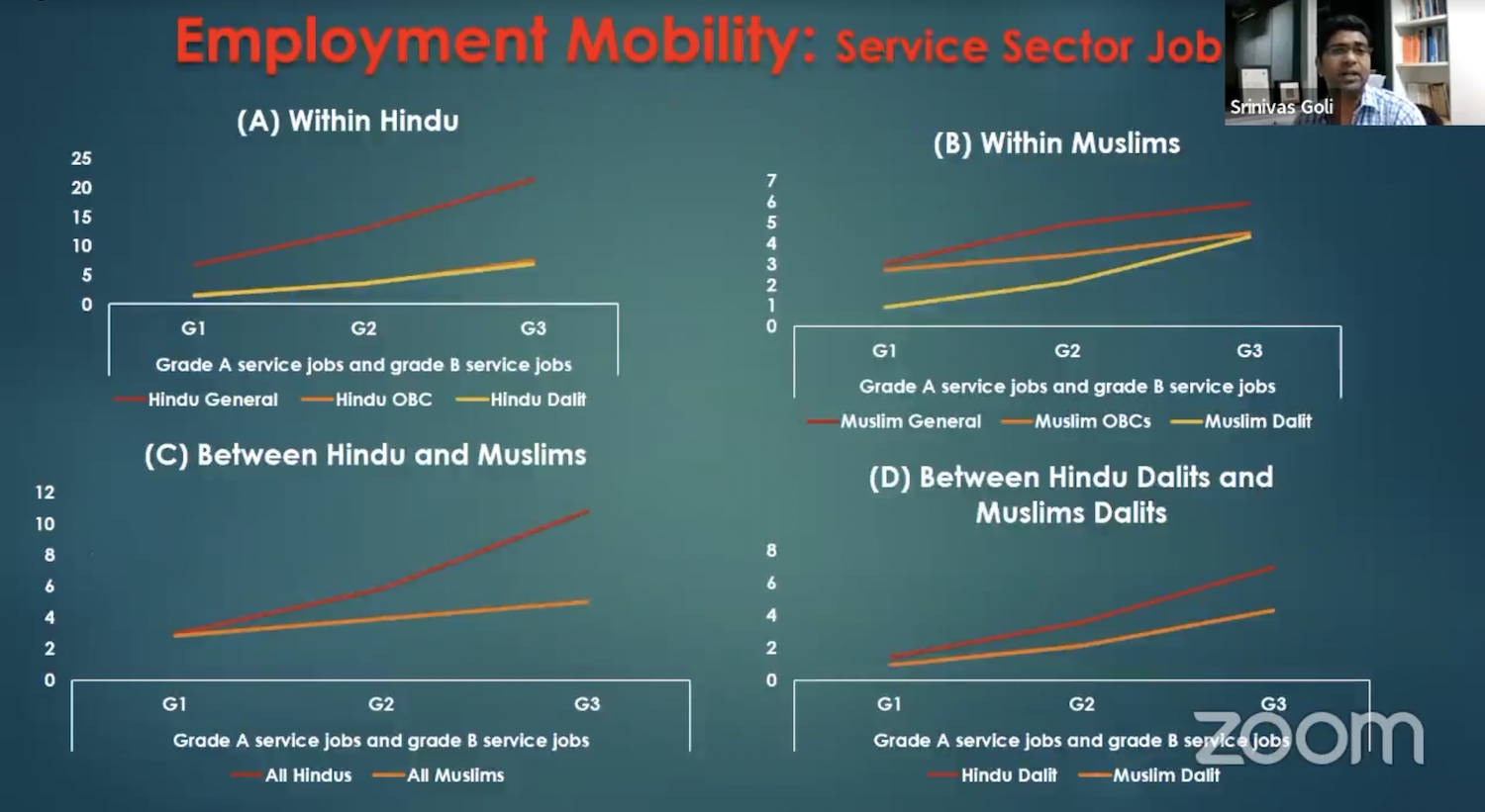Among the oldest generation (G1) the divergence was least between religions and castes. With history Hindu Dalits came to be kept out of Grade A and B service sector jobs, as did Muslims overall. The divergence grew least between Hindu and Muslim Dalits