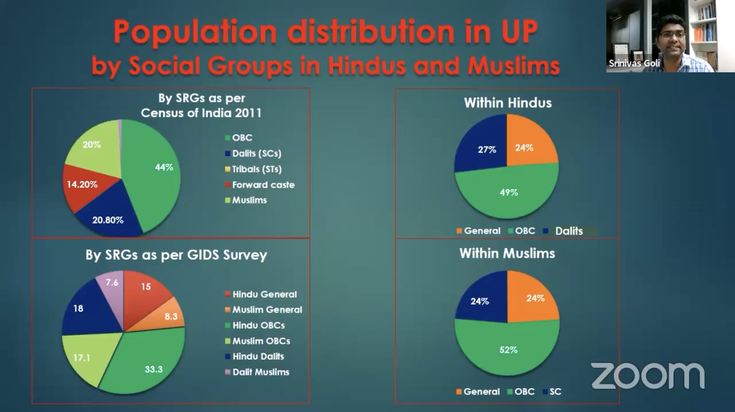 The pie on upper left shows the Census population of the administrative categories FC, OBC, SC, Muslim and ST in Uttar Pradesh. Lower left, this caste data is partitioned by religion, as found in the survey conducted by Goli and his colleagues. On the right, the Forward Caste, OBC, Dalit population share among Muslims and Hindus