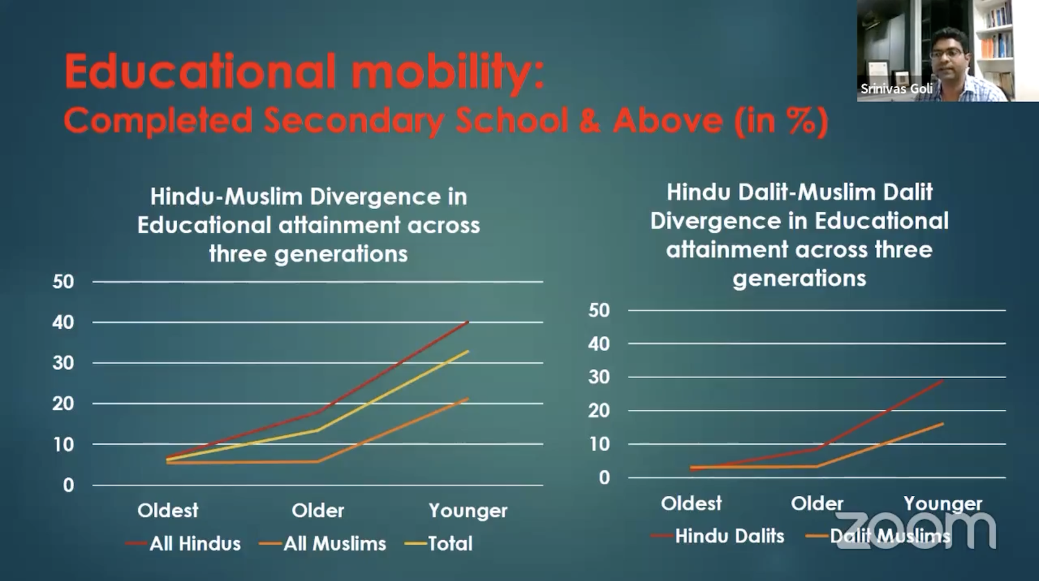 Among Muslims and Hindus, the oldest generation of respondents had similar opportunity to complete an educational degree, and with younger generations the divergence kept growing. Among Dalits, Muslims started off with slightly better educational attainment and the younger generations of Muslims were increasingly denied access to education