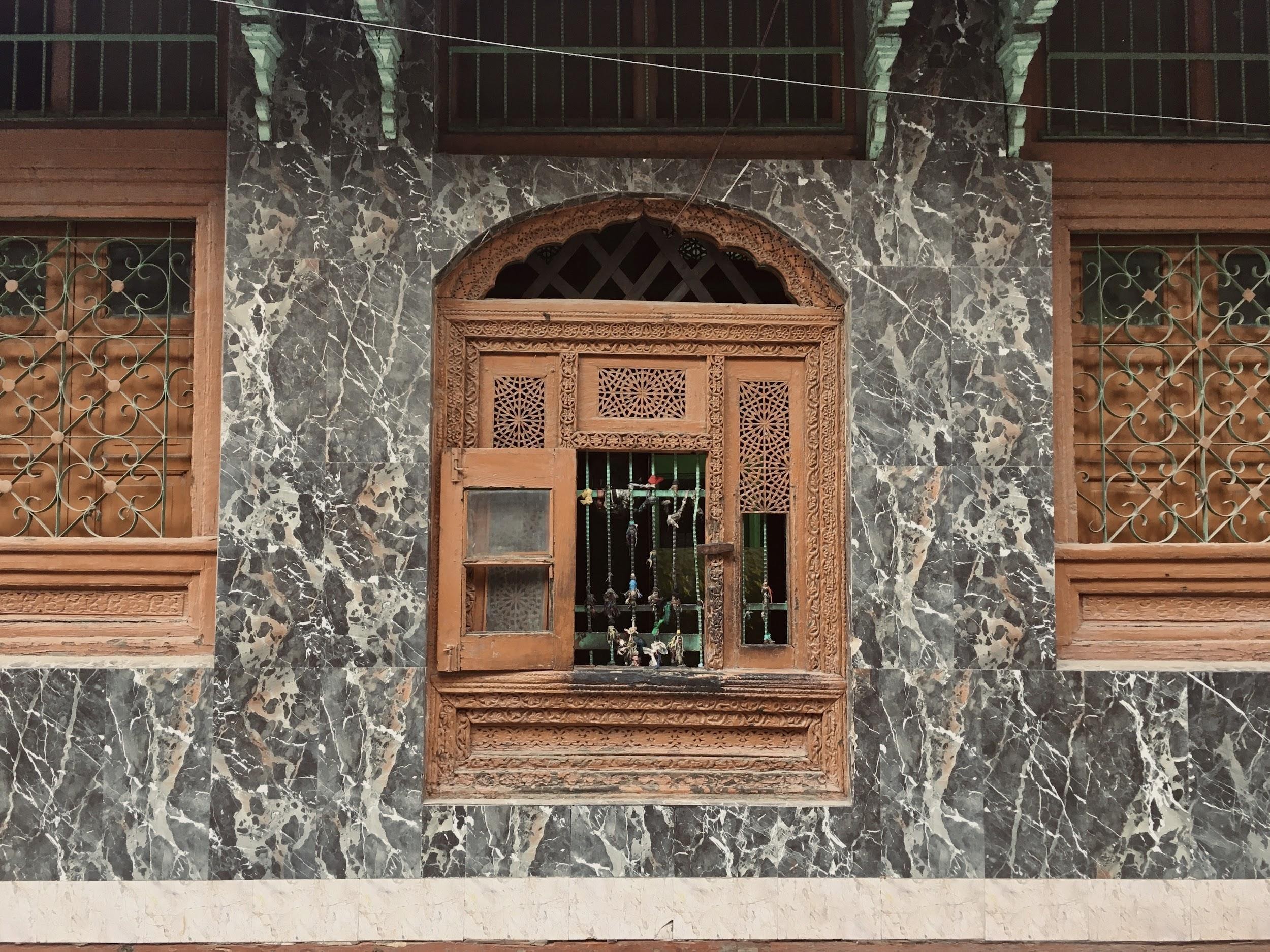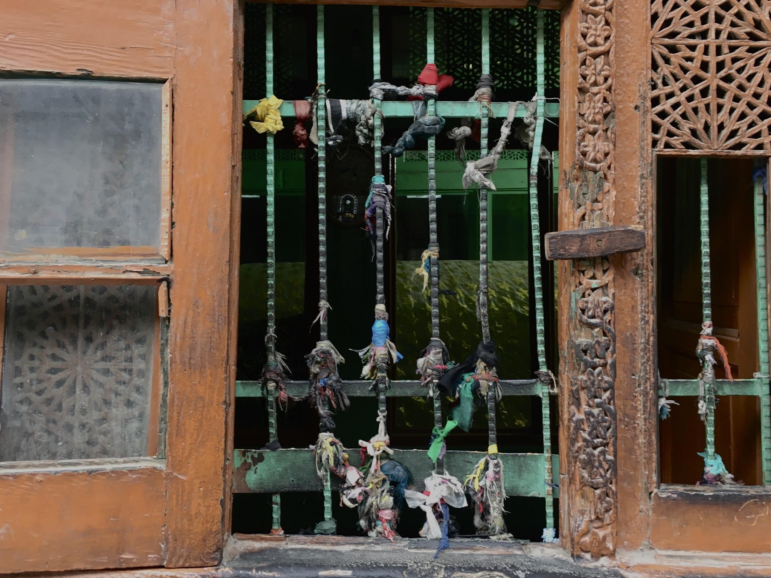 A small door leads to the interiors of the shrine, which opens only on the 13th of each Islamic month. An old glass-paned grilled window, with ribbons and threads tied to the iron rods, remains open alongside a narrow alley, giving a glimpse inside the dimly lit shrine.