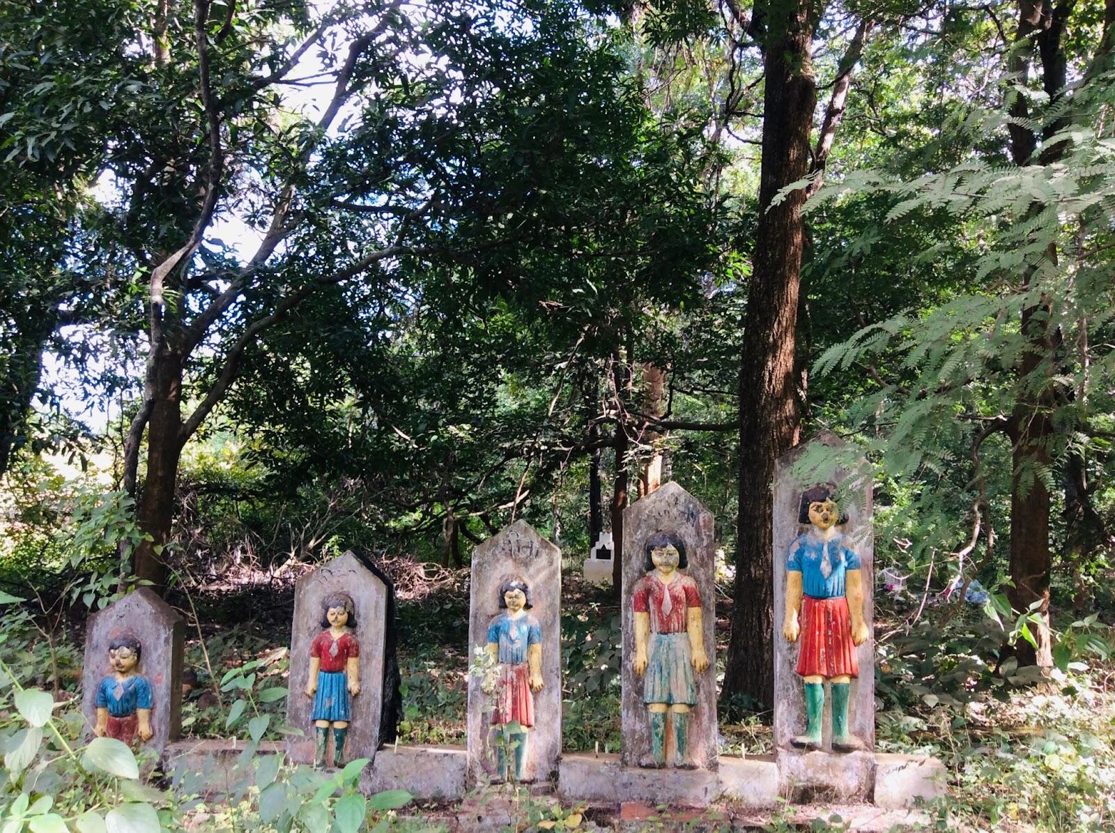Kirandul, 39 km from Dantewada district in southern Chhattisgarh, is full of rich iron ore deposit mined by the National Mineral Development Corporation. In this picturesque place famous for the Bailadila mountain range, an afternoon journey revealed an interesting sight. Just along the roadside, five vertical pillars of varying height and bearing the embossed figures of four girls and a boy stand together under the shade of trees.