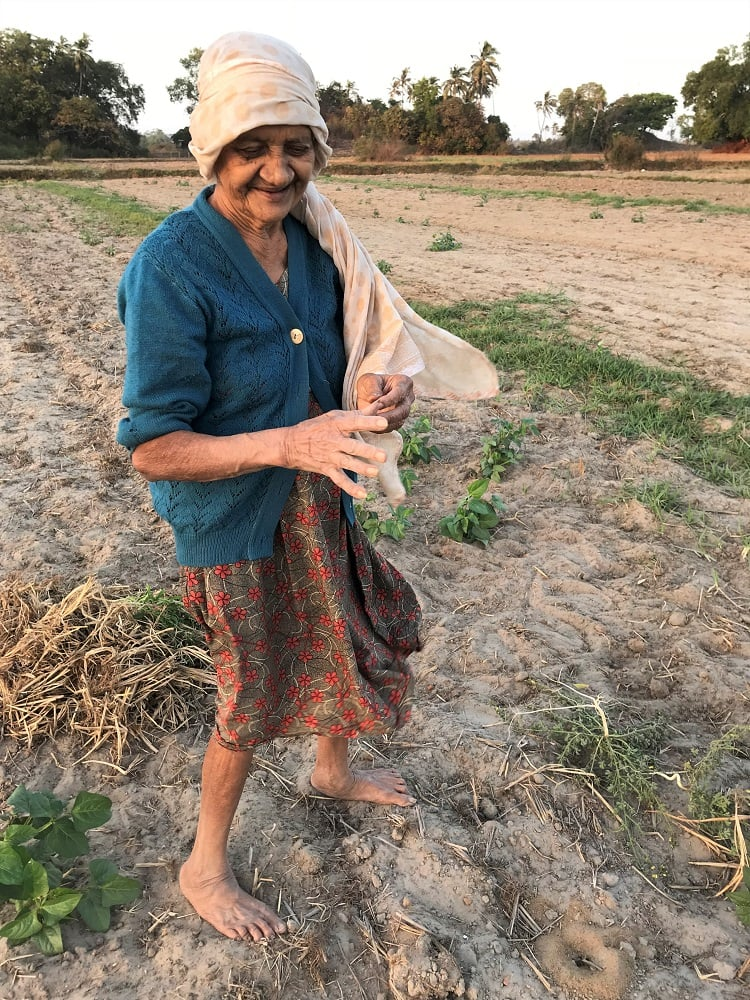 She loves to potter around in her field and nurture a few plants that are left after the cows have destroyed her crop. She still plods on feeling confident standing on her two aged feet working with her calloused hands wearing a perfect smile on her face as she chats with me animatedly.