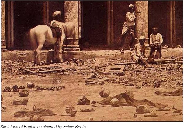 The origin of this first Indian scandal of photojournalism seems to be the diary of Sir George Campbell, a top army officer of the East India Company. He entered in his diary that Beato probably had the human remains of Sowars or native Bagis excavated and strewn around the campus of Sikandar Bagh.