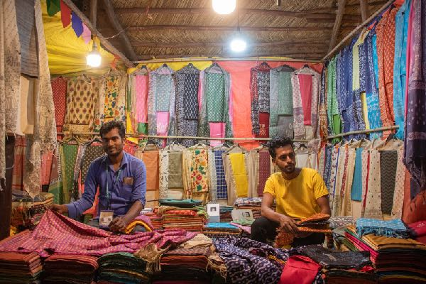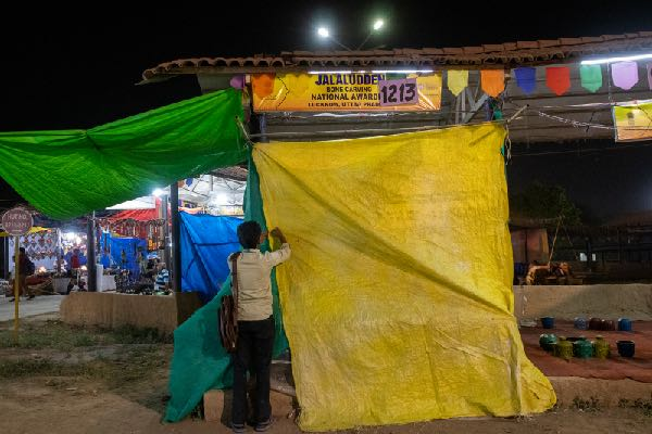 Vrajesh (L) and Sam (R) at their stall during evening hours at the mela. They belong to Jharkhand and Bihar respectively, both invested their savings to exhibit at the fair. Unfortunately, they have not reached their expected goals this year due to the low footfall. “There wasn’t any scope for profit this time. It was more about surviving through the mela somehow,” recalled Sam.