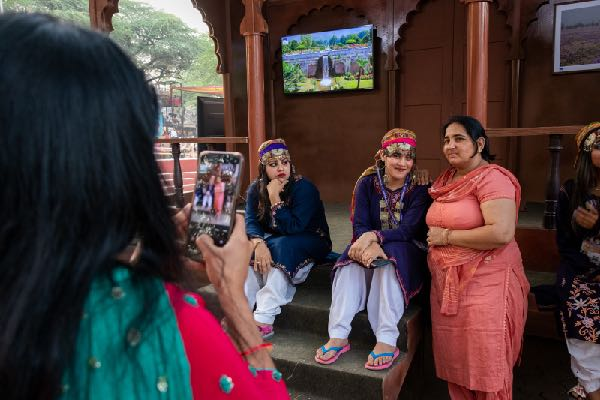 Visitors take photographs with artists waiting for their performance slots. Every year the mela decides on a theme state and a partner nation. This year, Jammu and Kashmir was the theme state and Uzbekistan the partner nation.