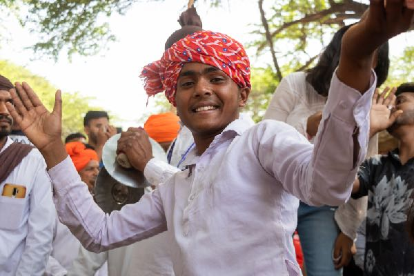 Pinku, 18, one of the youngest members of Bijender Singh Nagada Party from Palwal, performs at the fair. It is his second time here, and he feels happy to get back to performing in front of a live audience. But he realised his seniors were struggling to cope, due to the rise in temperatures, and low footfall of visitors. His group has been performing at Surajkund for the last 25 years. This year was the lowest footfall his group has seen which has affected their enthusiasm deeply.