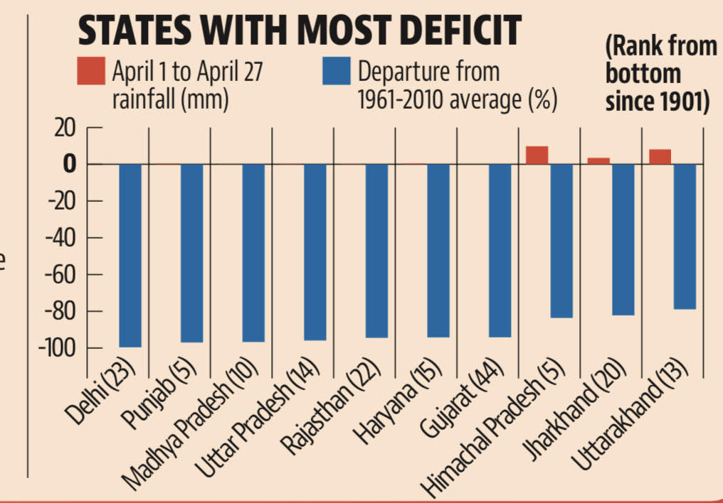 The proximate reason for the temperature rise in March was the non-receipt of rains caused by western disturbances. India received 89% and 83% less rainfall than average in March and April, and temperatures rose sharply due to the lack of humidity in the air.