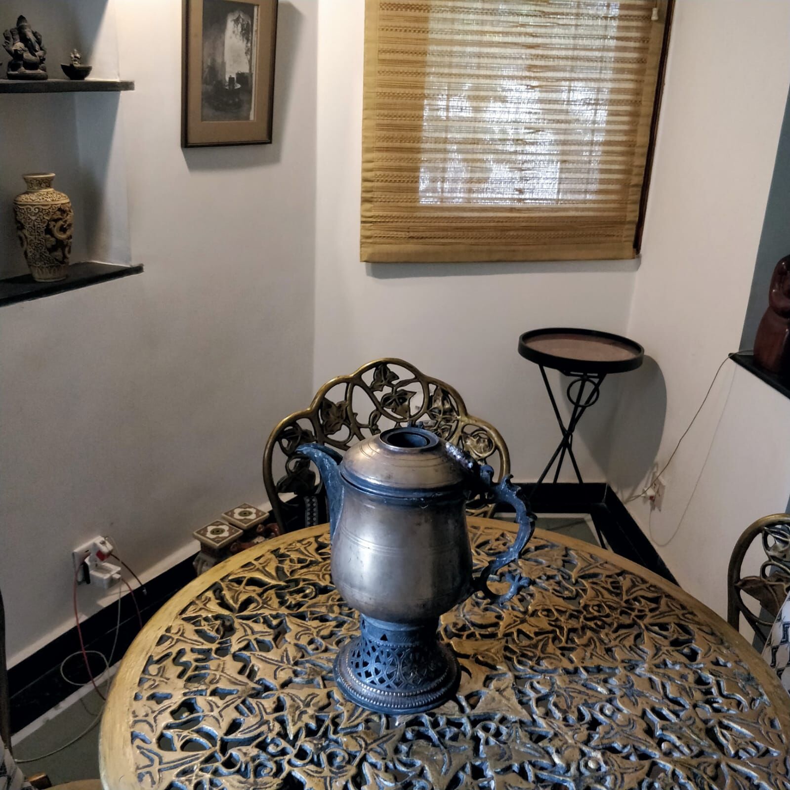 In our itinerant Air Force moves from place to place, my samavar has been a treasured family heirloom. Around a century old by now, a little dented it still has a certain swag. The brass is a little tarnished with a patina on the lower fretted base. The lid of the charcoal funnel is missing yet it has a presence because of the memories associated with it.