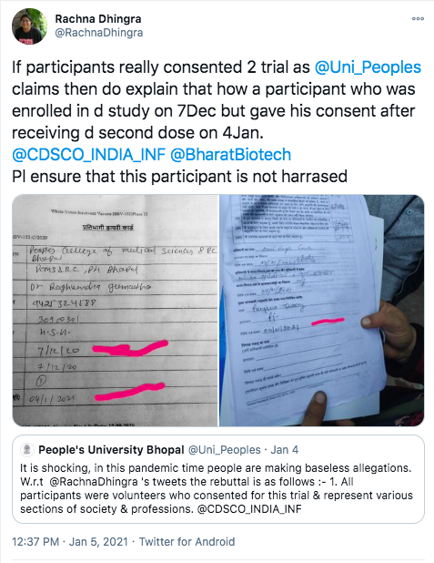 Dhingra claimed that these vaccinations began on December 1. “After we raised this issue, January 4 is the first time people started getting it (consent forms). But not everyone at that,” she stated, adding that other institutions in Bhopal that were approved to hold Covaxin trials have been unable to obtain volunteers.