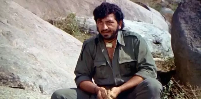 Sippy said that he wanted to replace the normal dacoit costumes in films of shirt and dhoti with olive green safari suit that would resemble military fatigues. So, Gabbar’s costume comprised of this olive-green safari suit, a metallic taveez strung on a black thread across his neck, a cartridge-lined belt he sways this way and that to threaten his men, and a small cloth bag of khaini he chews from time to time and spits out at random. His boots are smart too but covered with a layer of dust. His curly hair is unkempt and he shaves rarely.