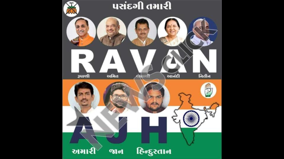 The poster has photographs of Gujarat Chief Minister Vijay Rupani, BJP President Amit Shah, Bhavnagar MLA Jitu Vaghani, former Chief Minister Anandiben Patel and Deputy Chief Minister Nitin Patel) to connote ‘RAVAN’, while ‘AJH’ represents OBC leader Alpesh Thakore, Dalit rights activist Jignesh Mevani and Patidar quota agitation leader Hardik Patel.