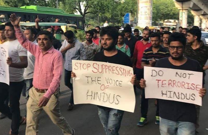 The placards in the hands of the protesters read, “Stop suppressing the voice of Hindus” and “Do not terrorise Hindus”.
