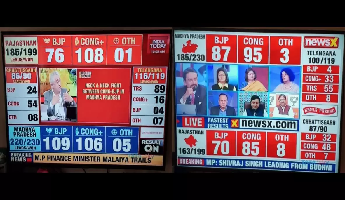 Around 10 o’clock this morning, India Today was showing BJP in the lead in MP with 109 seats. At the exact same time, CNN News 18 was showing Congress and its allies in the lead, also with 109 seats.