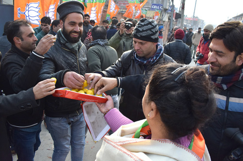 BJP Kashmir wing celebrates Gujarat/Himachal results. Photo Basit Zargar