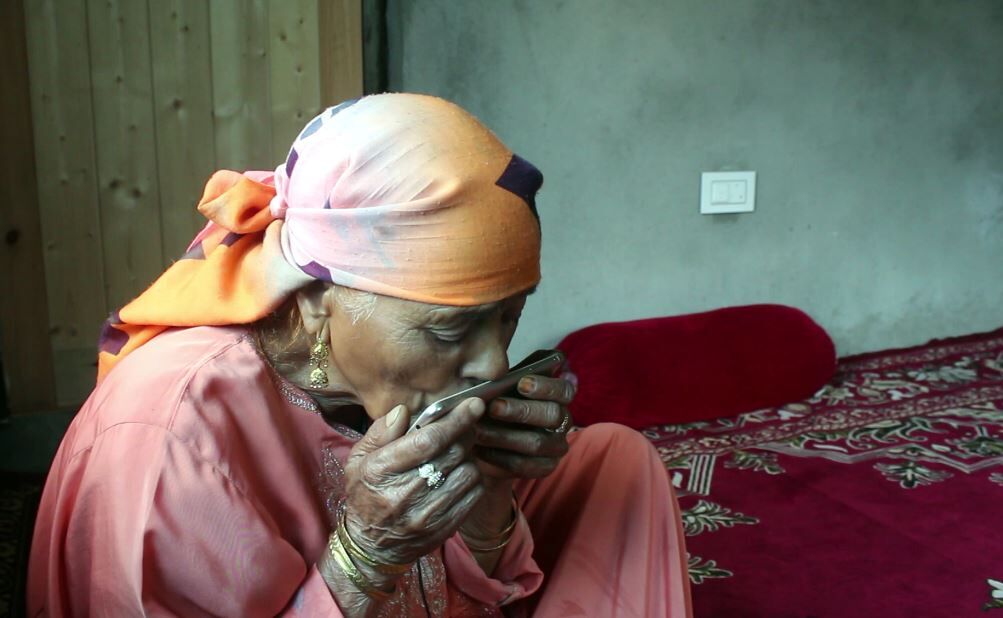 Below are photographs of Mir recording the song, the Ha Gulo artists with their instruments, and their house in Kashmir. His mother kisses the mobile as she watches her son sing.