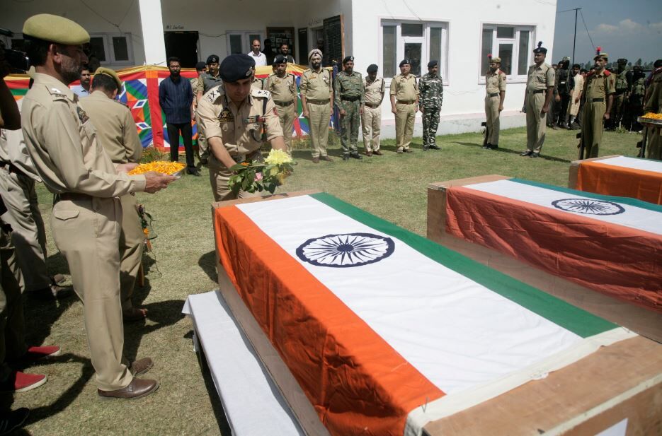 (Cover photo BASIT ZARGAR: the funeral of three policemen killed recently by militants in Shopian, Kashmir.)