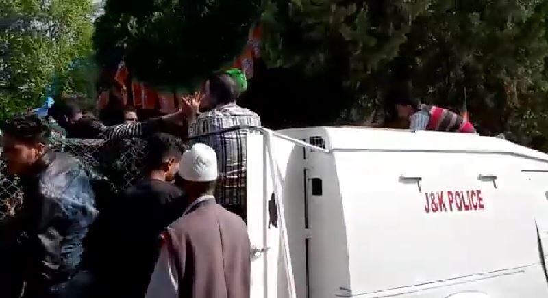 The ‘J&K Police’ is prominently displayed in red on the white Maruti Gypsy vehicle. Buntings of BJP are prominently visible in the area where the video has been shot.