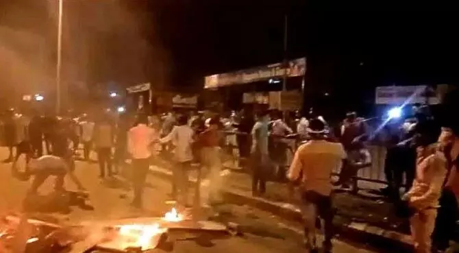 Cover Photograph; Stranded migrants come out in protest on the streets in Surat, Gujarat, set carts on fire