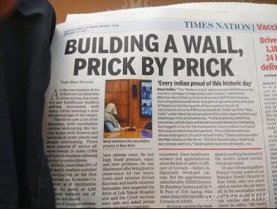 Here's the second example of Vaccine Humour, though I suspect unintended. Now, one was aware that our journalism had descended to Mariana Trench depths in recent times, but this takes the lemon tart. The article refers, of course, to the vaccine wall being figuratively built by the govt. to protect its citizens, but the terrible pun is an error of phallic proportions. It is certainly not a printing error- one prick can be a printer's devil, but two pricks has to be the editorial board! One has read of arm in arm friendship, hand in glove chicanery, ball by ball commentary, but a prick by prick wall is a first for me.