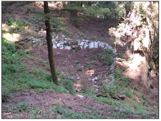 The dry watercourse and its broken check dam.