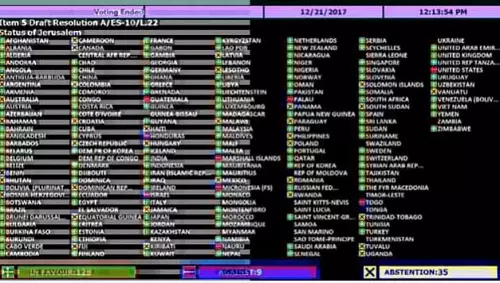Adopted at an emergency special session of the General Assembly on Thursday, the resolution was a devastating attack against Trump’s recent unilateral decision to recognize the historically disputed city of Jerusalem as the capital of Israel and a pledge to relocate the US embassy from its current location in Tel Aviv—the only country to do so.