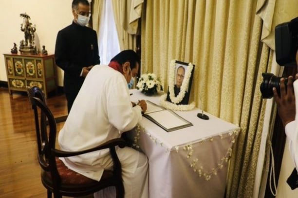 Mahinda Rajapaksa writes in the condolences book at the Indian High Commission in Colombo