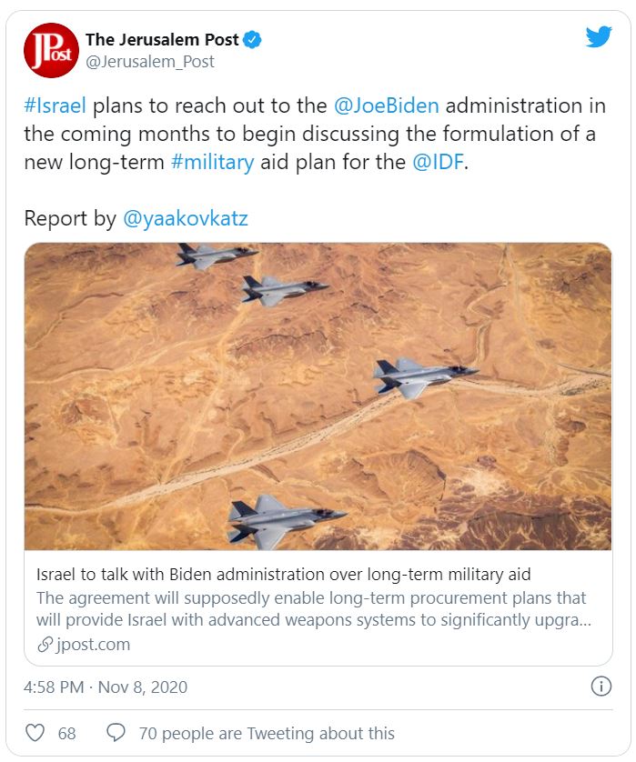Now, according to The Jerusalem Post, “Israel plans to reach out to US President-elect Joe Biden’s administration in the coming months to begin discussing the formulation of a new long-term military aid plan.”