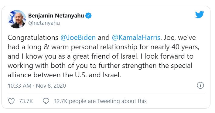 “Joe, we’ve had a long and warm personal relationship for nearly 40 years, and I know you as a great friend of Israel,” Netanyahu wrote in a tweet addressing President-elect Biden and Vice President-elect Harris.