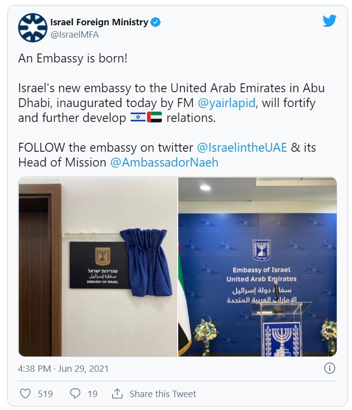 Lapid – also the alternate to Israeli prime minister Naftali Bennett – inaugurated the new Israeli embassy in the UAE capital Abu Dhabi.