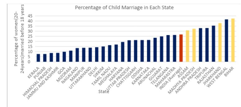 As opposed to a national average of 27% child marriages, states like Bihar (42.5%), West Bengal (41.6%), Jharkhand (37.9%), Rajasthan (35.4%), Tripura (33.1%), Andhra Pradesh (33%), Madhya Pradesh (32.4%) and Assam (30.8%) have a higher percentage of child marriages. Almost all these states are poorer than the national average.