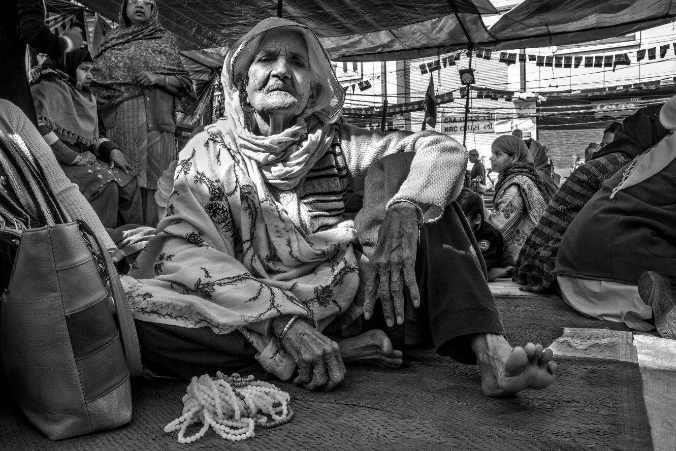 Bent over with age and the silence that often comes with it, Bilkis sits with a handful of women, prayer beads in hand, framed against the banner that urges “Reject CAA, Reject NRC” in the background. The image of Ambedkar looks down from its post high above a pole on the makeshift stage. The stage stands empty as of now, waiting for speakers to arrive along with the crowds in the evening. Speeches will be delivered, and slogans will be chanted, words which will reach a crescendo and make the crowds echo in unison.