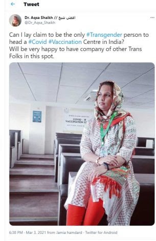 “Can I lay claim to be the only #Transgender person to head a #Covid #Vaccination Centre in India? Will be very happy to have company of other Trans Folks in this spot,” she wrote on March 3, 2021.