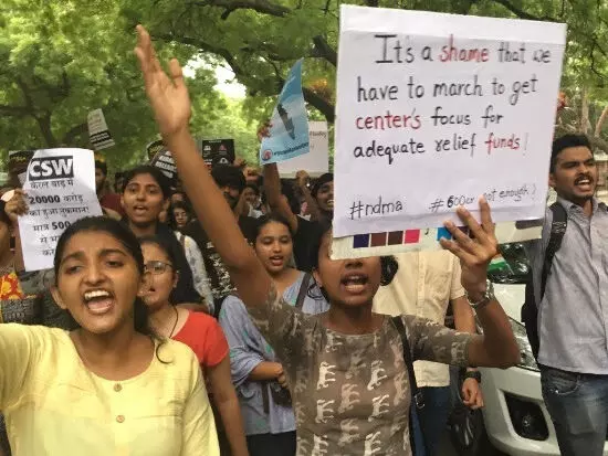 Other speakers echoed Waseem’s sentiments. “I stand here today as a representative of each and every student of Kerala,” said a student from Jesus and Mary College. She lamented, “It’s a shame that we have to march to get Centre’s focus for adequate relief funds.” Saying funds should be naturally given, she asked, “Is Kerala not part of India?”