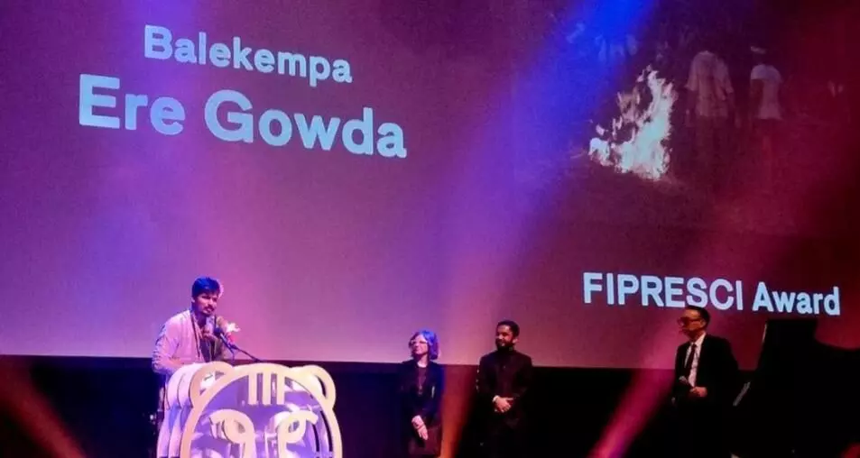 Typically, Gowda remained unfazed as he made his first trip abroad. This was to attend the 47th Rotterdam International Film Festival where his debut work was in competition in the Bright Future category amongst eighteen others. His film won the coveted The FIPRESCI (International Federation of Film Critics) Award. In 2017 ‘Balekempa’ was at the Film Bazaar’s Work in Progress section, where it won the Prasad Digital Intermediate (DI) Award. On stage, while receiving his FIPRESCI award in Rotterdam, Gowda profusely thanked his Film Bazaar mentors: Marco Mueller, Philippa Campbell, Olivia Stewart and Jacques Comets.