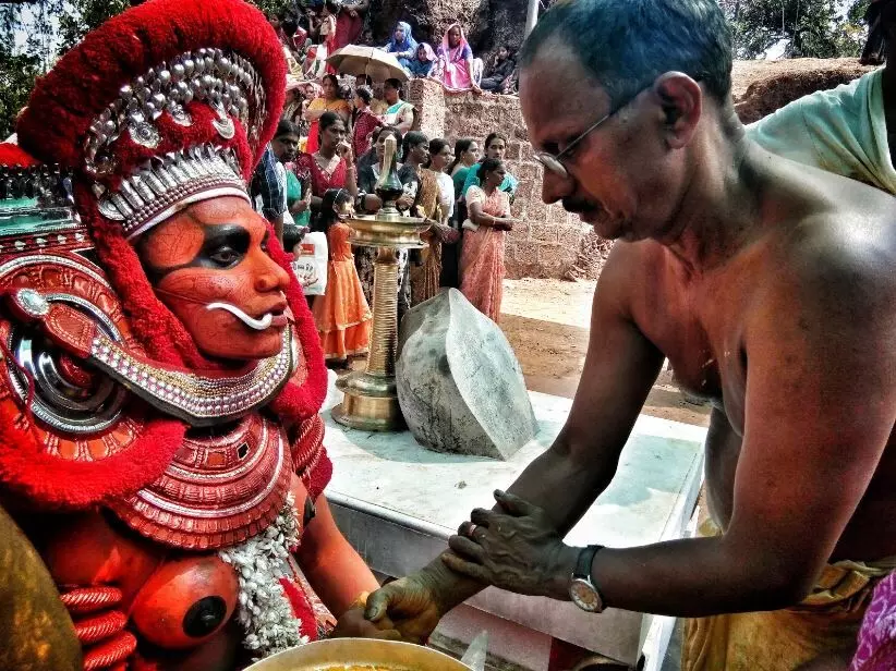 Devotees worship the Theyyam, touch their feet, whisper their problems in their ears, seek blessings for newborns and express their anxieties in hopes of redressal when they are dazed in a trance.
