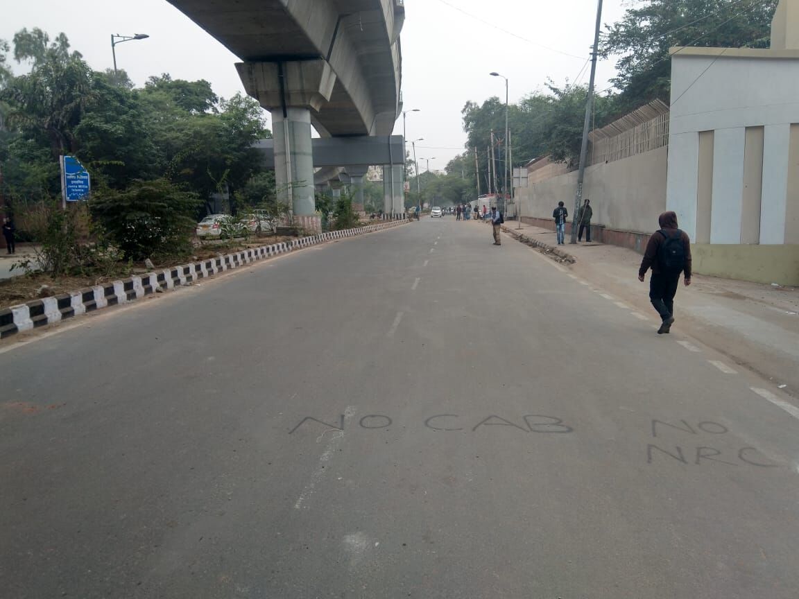 People weren’t running here, or raising slogans or marching in large crowds- but you could see the vestiges of the violence that had wreaked the campus the preceding days. Graffiti and spray-painted slogans on the walls decrying the government, the Act, the police and the death of our democracy were on every turn, and students and teachers roamed the grounds quietly- not in large numbers, but in close-knit groups.