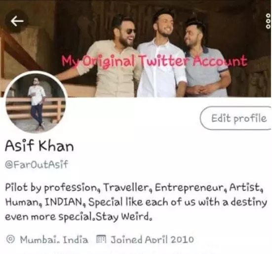 Khan’s twitter handle describes him as “Pilot by profession, Traveller, Entrepreneur, Artist , Human INDIAN, Special like each of us with a destiny even more special. Stay Weird. Unlike the other account that has a handle @MdAsif35534489 his is @FarOutAsif.