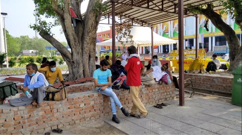 There was a clear distinction between the passengers coming from the road, well equipped with masks, gloves and trolleys, and these people sitting under the tree. Some of them were using their gamchas as makeshift masks. A balding man sat there swinging his gamcha left and right, for relief from the scorching heat that pierced the spaces between the leaves of that tree.